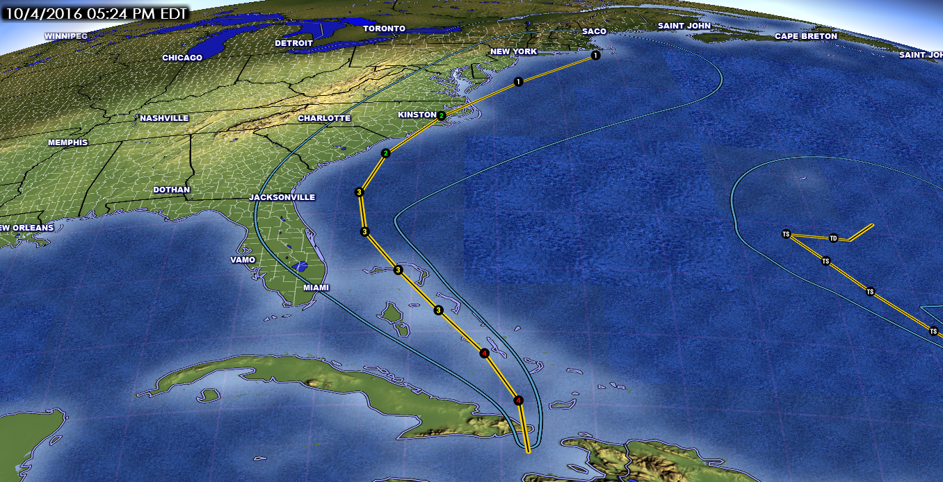 As for the near future for this storm, the storm will then track through the Bahamas as a major hurricane. Matthew has maintained category 4 strength through the Islands which should have been very disruptive but Matthew withstood the challenge. Since it will be entering an area that is very conducive for intensification I would expect the storm could maintain the category 4 status as it moves through the Bahamas. This storm doesn’t plan to be in much of a hurry either. It will take around 48 hours to pass through the islands all while maintaining major hurricane status. Since the islands do not have a mountainous terrain (in fact it is very flat and very spread out) to disrupt the storm and weaken it.